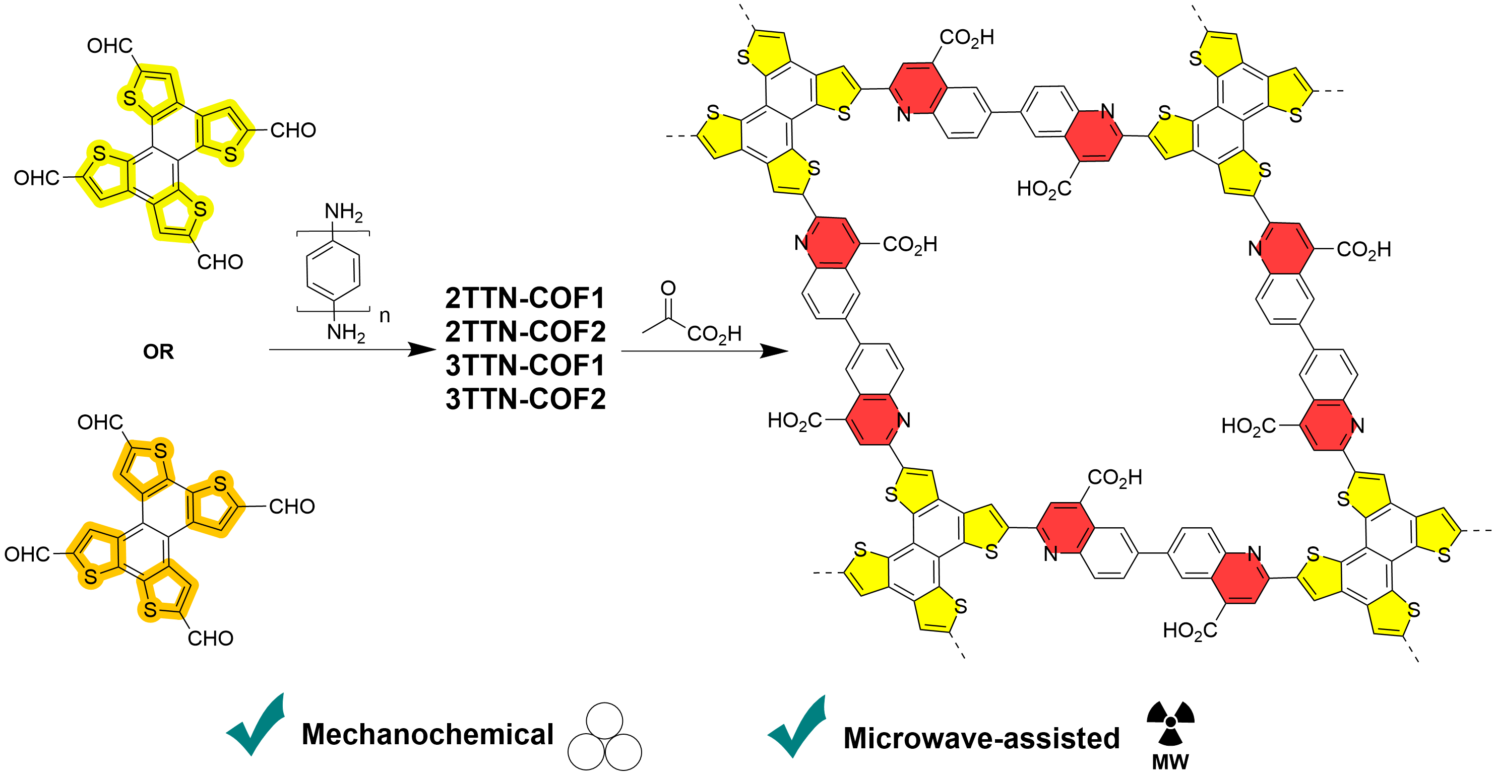 - Mechanochemical synthesis of π-conjugated naphthotetrathiophene-based covalent organic frameworks and their post-modification via the Doebner reaction